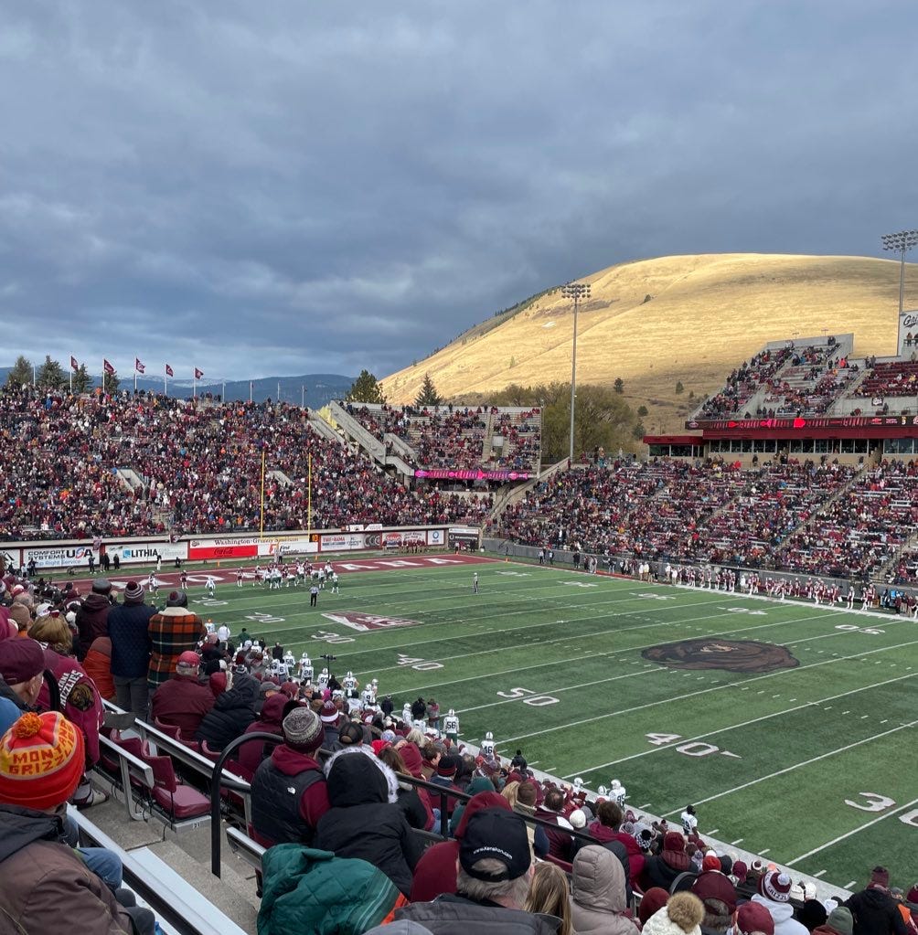 “MON-TAN-A … GRIZZ-LIES” chants snap you out of your ethereal daze and you remember that you are about to watch the gladiators square off for seeding in the Big Sky conference. Individuals with internet brain rot can turn their eyes towards the M mountain and observe people who appear to be smaller than ants hiking to the peak all throughout the day. Passionate Montana football fans who brave the ‘dry cold’ (it’s freezing. Don’t let them trick you into thinking that it’s warmer than oceanfront windchills) are engaged, loud & very well-versed in the sport.