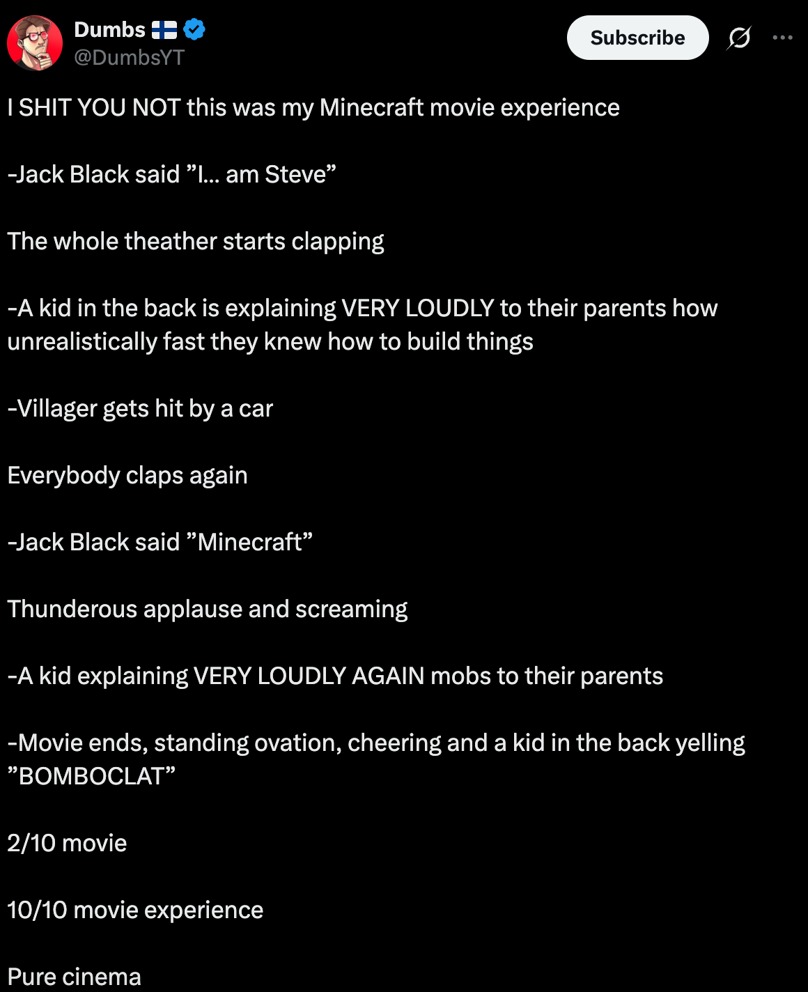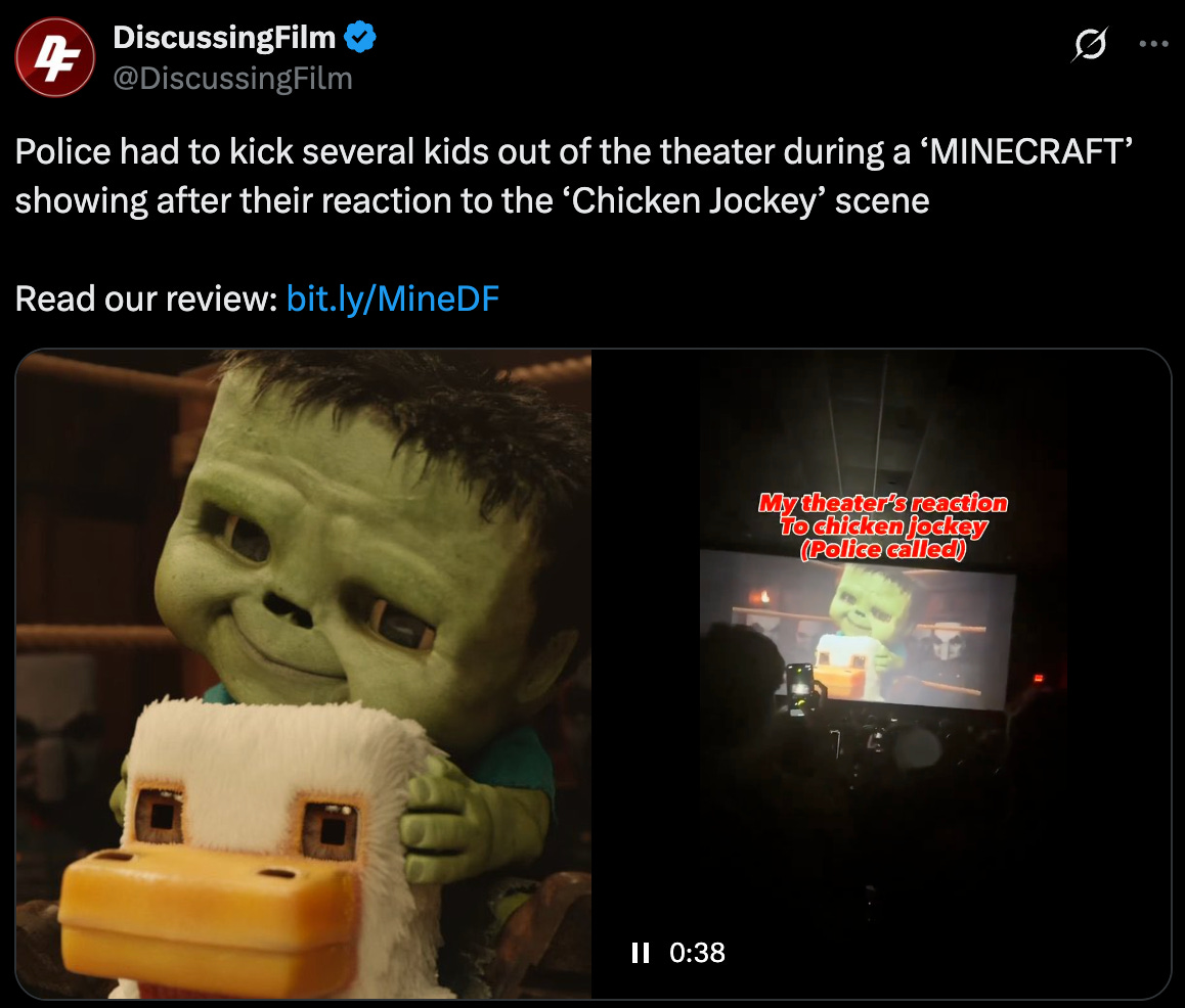 Warner Bros. deciding to make a Minecraft movie is an irony hurricane. You have a strong contingent of gamers, memers, trolls & a lot of people on Discord. The 60 year old movie exec looked at the popularity of the game, got casting recommendations & put his feet up thinking it would be a no-brainer. Well, the kids are protesting your bad movie by loving it. In the funniest possible turn of events, Minecraft fans & general teenage disruptors are causing chaos in theaters during this film.